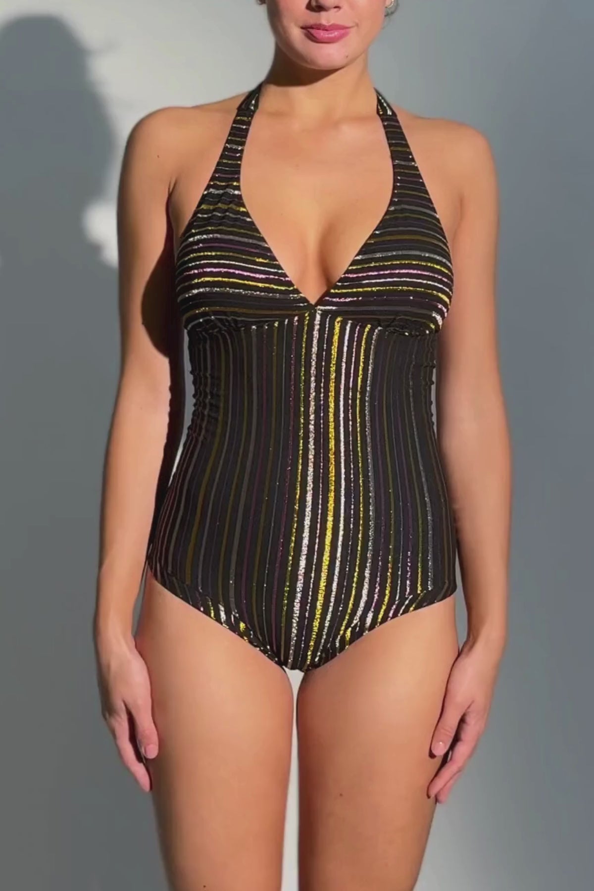 - Description: Swimsuit with a halterneck that ties at the neck. The suit has a beautiful low-cut back that makes it extra feminine. The swimsuit has thin removable inserts, so it fits both small and large busts. The fabric has a light texture on the surface.