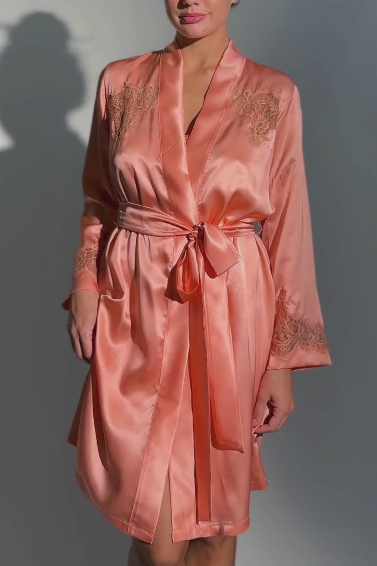 - Beskrivelse: Denne drøm af en silke kimono, har smukke blonde detaljer på ærmet og ved skuldrene. Kimonoen er håndlavet i Italien med fine gamle teknikker. Den har små bindebånd indvendigt, så den ikke glider fra hinanden når man har den på. Et bredt bælte til at samle kimonoen om kroppen høre også til.