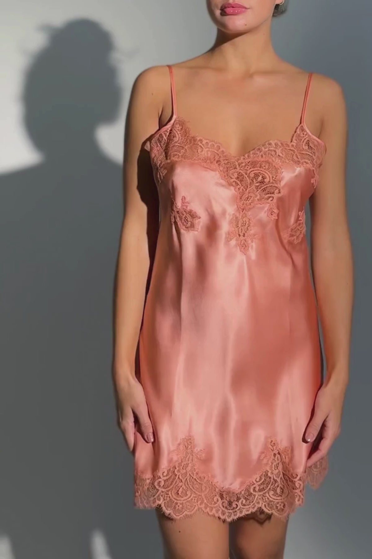 - Beskrivelse: Denne drøm af en silke underkjole har smukke blonder strøet ud over kroppen. Kjolen er håndlavet i Italien med fine gamle teknikker. Stropperne kan reguleres i længden med små fine glidere. Måler 67 cm i sidesømmen.