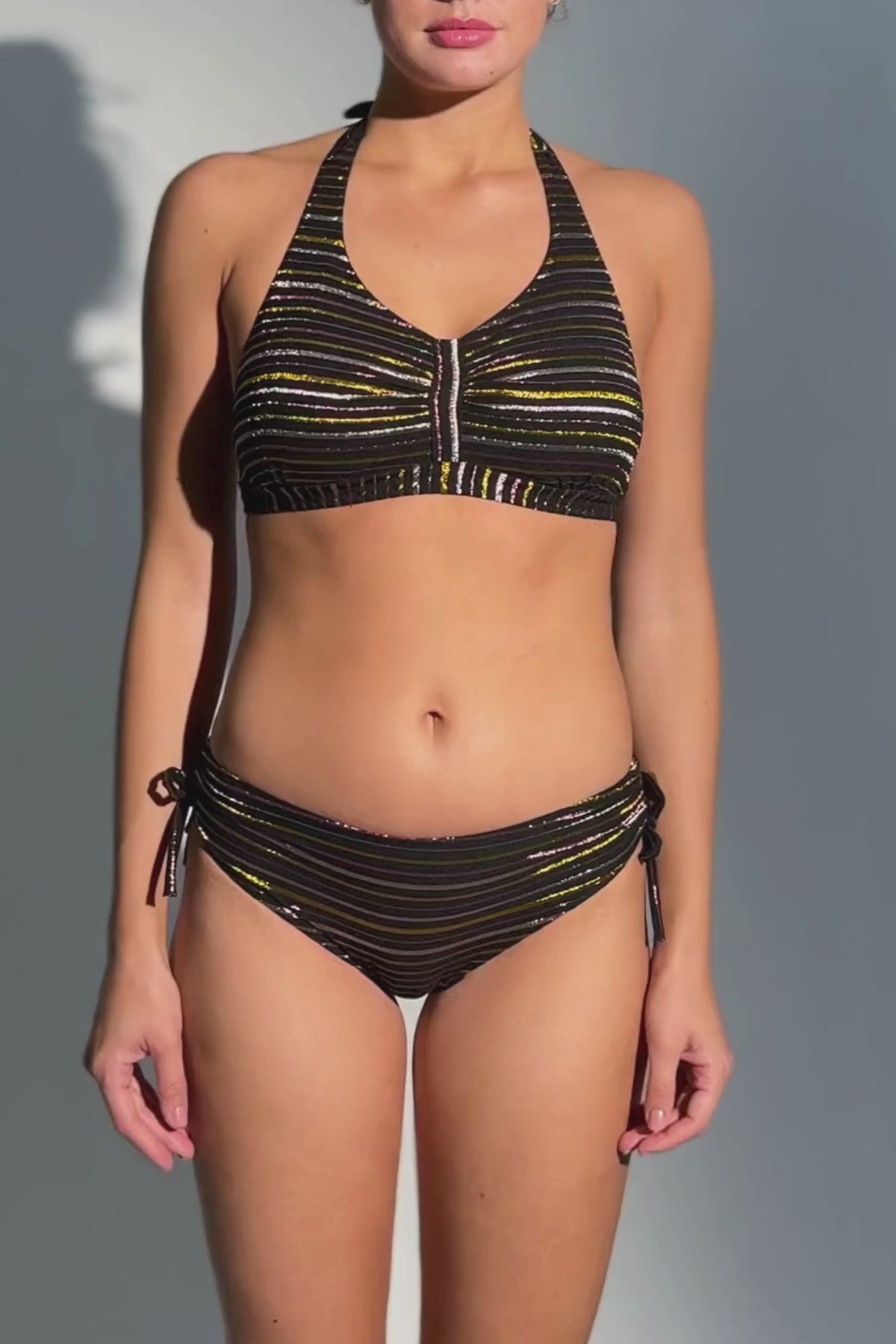 - Beskrivelse: Helskål bikini top med halterneck der bindes i nakken og ryggen. Denne bikinitop er udviklet med særligt henblik på en større og tungere barm. Toppen går længere ud på siderne og giver støtte til brystet. Den dækker kavalergangen og har en fin rynkeeffekt foran der giver en god form til barmen. Bikini toppen har tynde udtagelige indlæg. Stoffet har lidt struktur i overfladen.